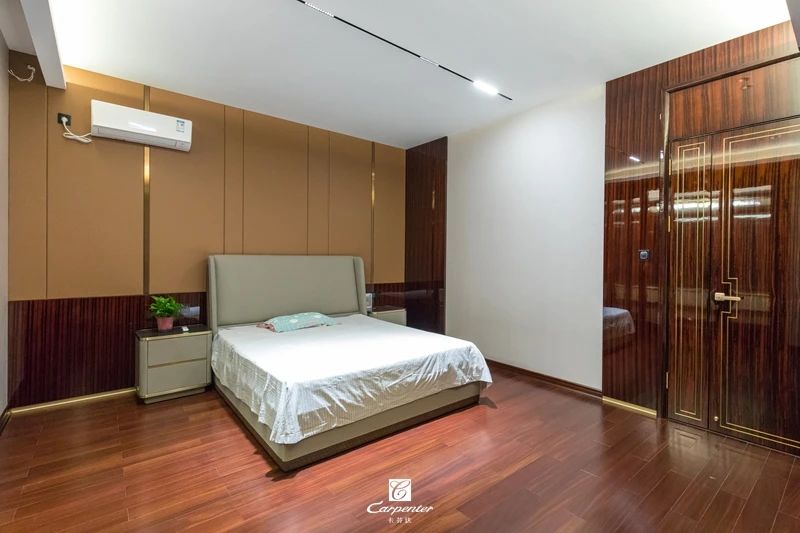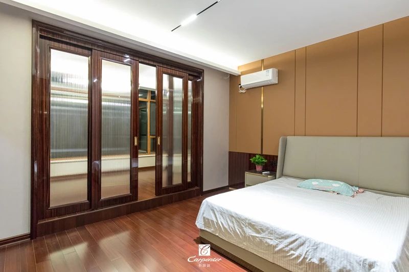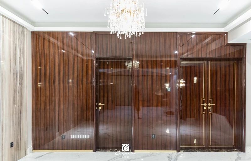 過道空間與臥室門選用黑檀木皮木飾面